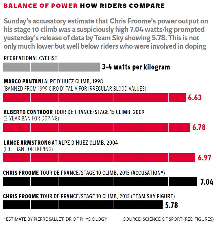 The Independent asked Michael Hutchinson, a former professional racer and author, to look at the figures and he concluded: “It’s a very plausible set of data that all hangs together. They’re well within the parameters I’d have expected, because the performances Chris has been putting in, with his weight, are not unbelievable. They’re just very, very good.”