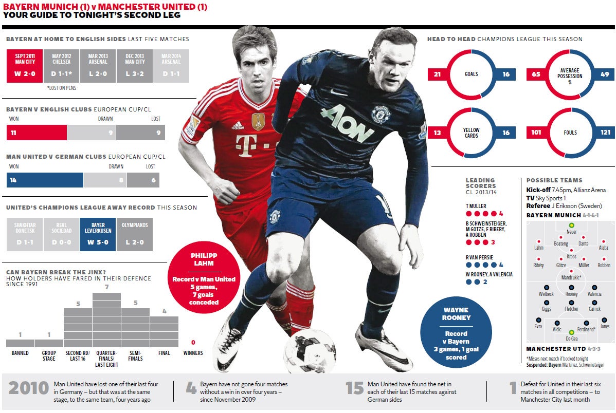 United will believe they can do the punishing. Wayne Rooney suggested last week that Bayern's high line is exploitable, as Danny Welbeck should have proved at Old Trafford, and a weakness to set pieces was also demonstrable in their zonal marking at Old Trafford.