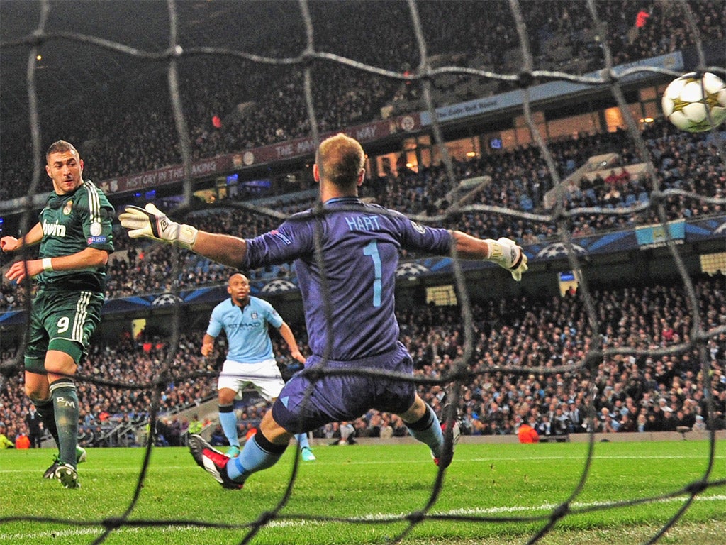 And none of that takes account of the latest piece of comedy defending which allowed Karim Benzema to deliver the Spaniards a 10th=minute lead in the first place. Angel Di Maria's clipped cross from the right looped over the head of a terribly immobile Maicon and with every member of the City defence transfixed, the ball arrived at the Frenchman's feet to poke it in.