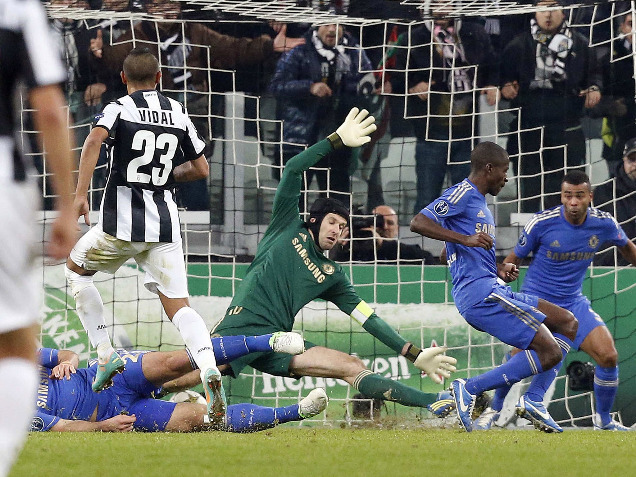 There were times at the start of the first half when it looked like Chelsea might cave in and they came to rely on the presence of Cech in goal in the early stages. He blocked a back post shot from Stephan Lichtsteiner with his knee in the fourth minute. Later he got down to push a shot from Claudio Marchisio wide of the near post.