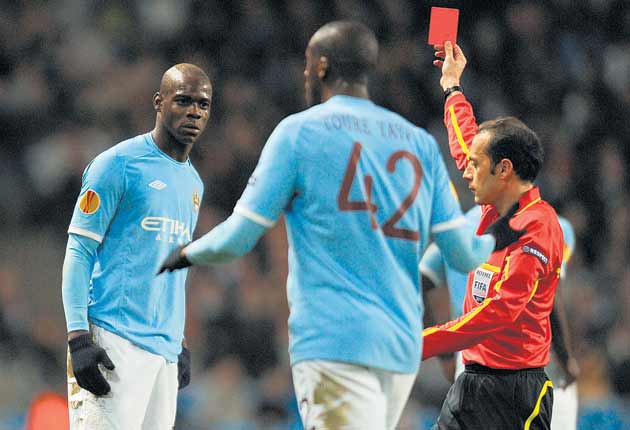 Whether an exit from the Europa League genuinely hurts is doubtful. Mancini and his club crave a top-four place vastly more than this piece of silverware, and 48 games into the season they are wilting. But the way the manager leapt into every last shot and challenge, such as substitute Edin Dzeko's late swivel shot and Yaya Touré's free-kick, underlined the damage Balotelli had done. Even at 10 versus 11 City were vastly superior.