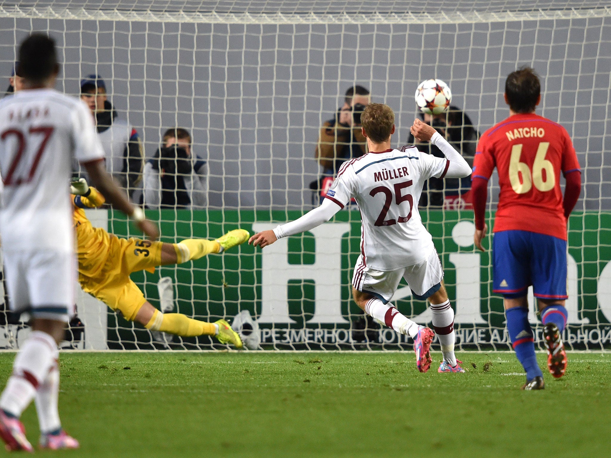 Muller put Bayern ahead from the penalty spot in the 22nd minute, after Mario Goetze was fouled by CSKA's Mario Fernandes as he dribbled into the box.