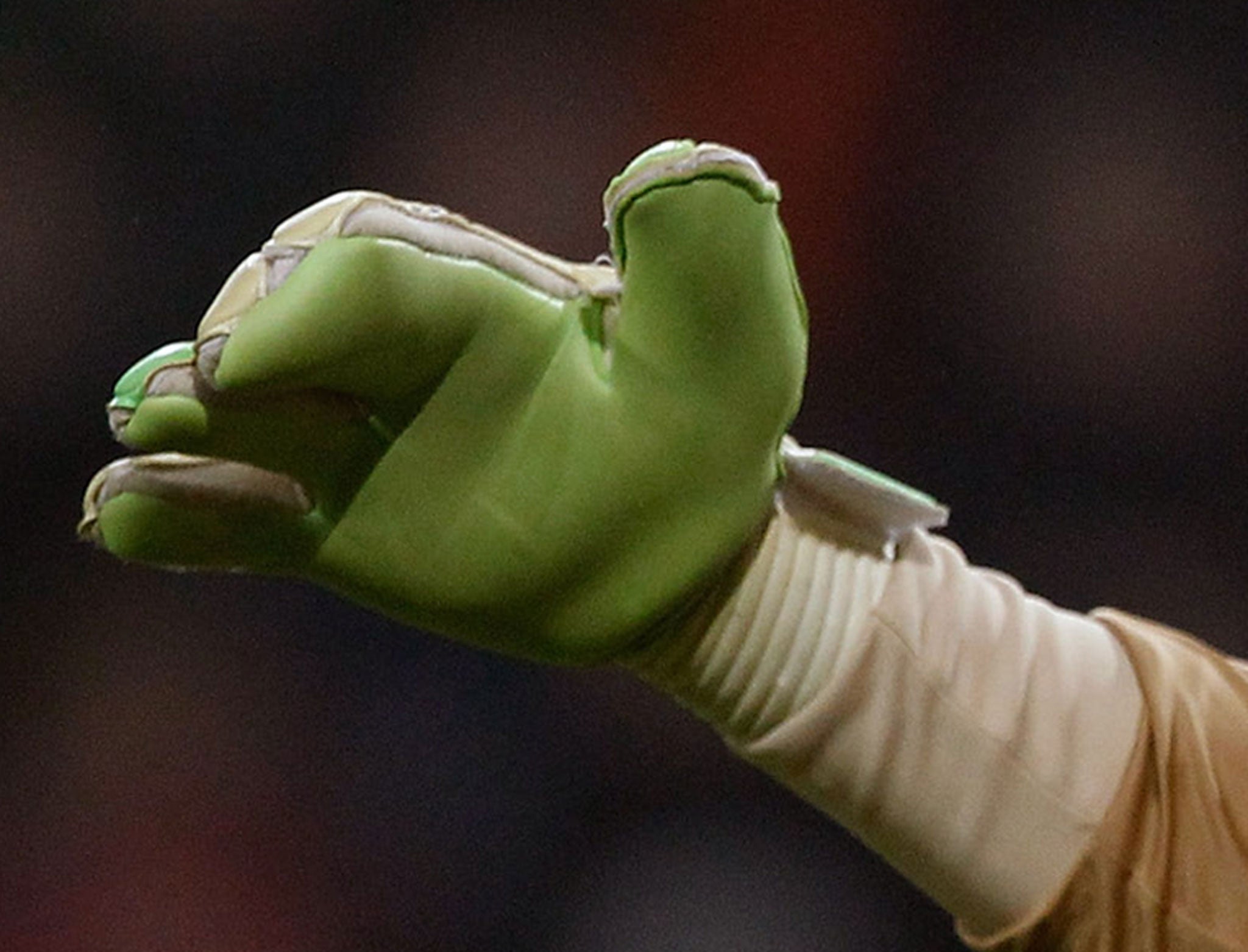 But clearly he thinks there's room for improvement, because he's adopted the weird innovation of a four-fingered (or three-fingered, depending on how you define the thumb bit) glove.