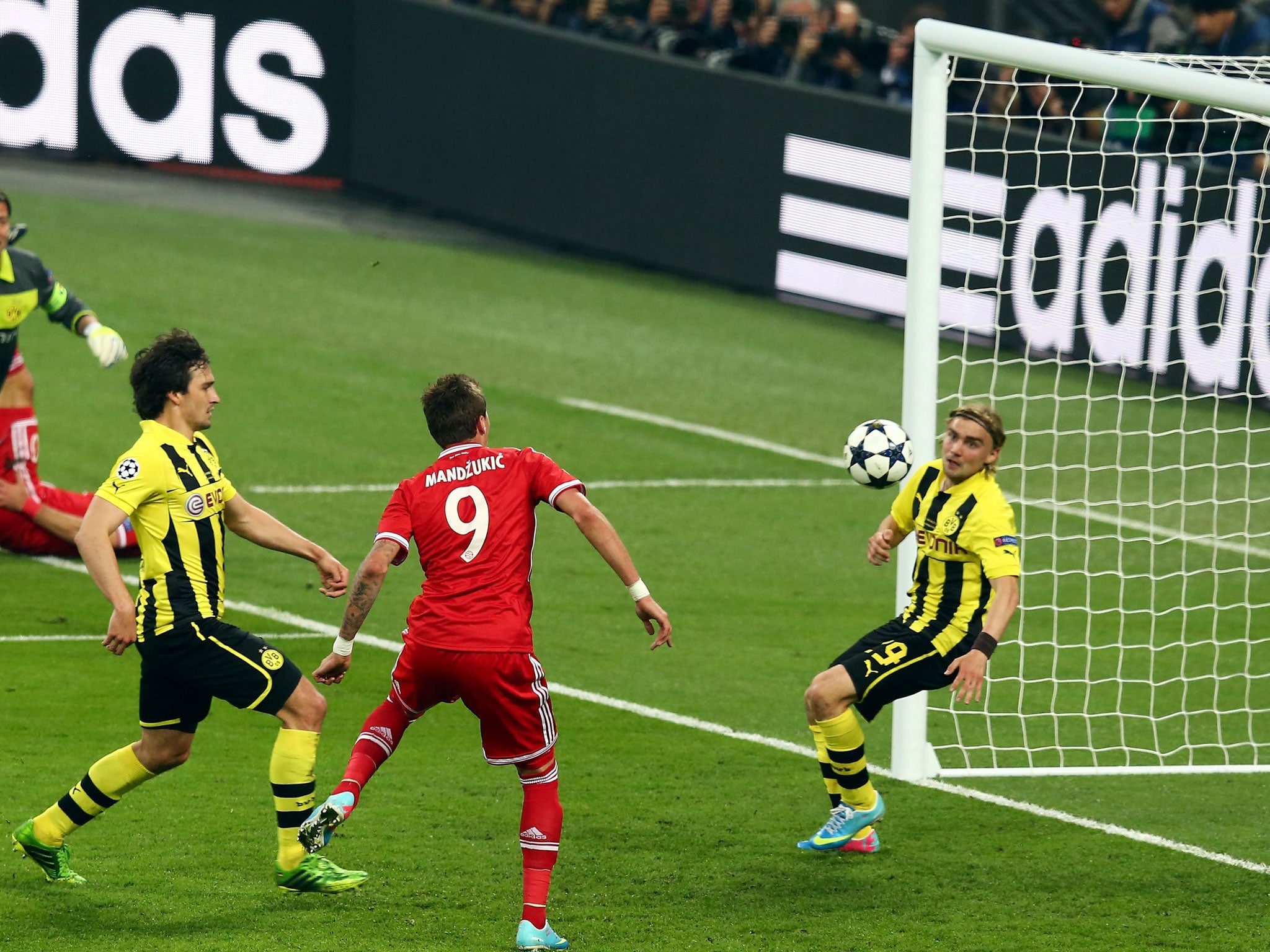 What followed in each case was more intricate. Mario Mandzukic muscled his way underneath the dropping ball from Neuer, played it off his chest into the path of Arjen Robben, who released Franck Ribéry. Robben kept running, making a smart break behind the Borussia Dortmund defence that Ribéry picked out; Robben then squaring for Mandzukic to tap in.