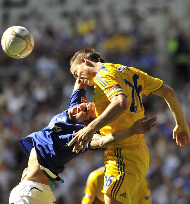 Before a quarter of the tie had been completed, an equaliser arrived from an entirely predictable source. Nicolas Anelka and then Lampard moved the ball to the left once more, where Malouda had time to measure a cross. Drogba reacted better than any of the four lurking Everton defenders. Joleon Lescott was outjumped by the Ivorian, thus extending a remarkable run at Wembley: a goal in every one of his five appearances here.