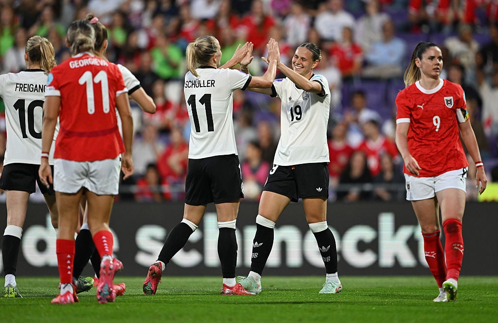 Germany's Sjoeke Nuesken and Lea Schueller struck in the second half to fire the eight-times champions to the verge of the Euro 2025 quarter-finals with a 2-1 victory over Denmark on Tuesday that left the Danes on the brink of an early exit.
