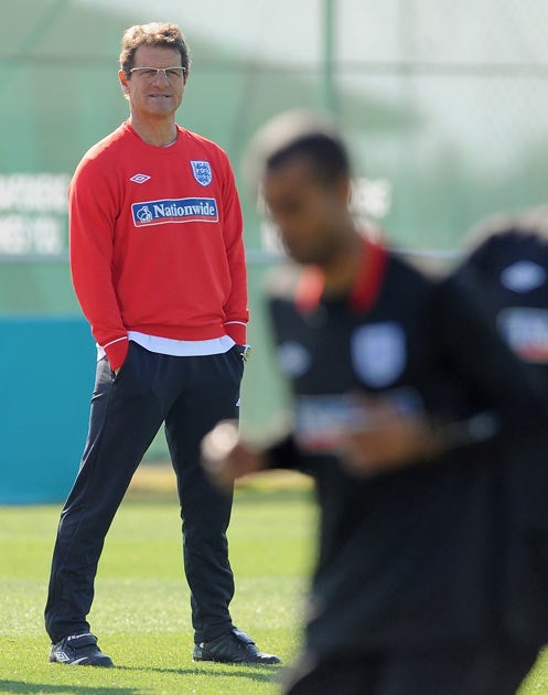 Though Capello acknowledges his players need to relax more when they play, he is sticking to his culture of discipline. "We are here to play at the World Cup and not for a holiday," he said ahead of a game he described as "one of the biggest of my career". The England manager acknowledged that the squad is not universally happy. "Probably one or two are not happy but the majority are happy," he said. He censured Terry for damaging spirits by suggesting on Sunday that Joe Cole and Wayne Rooney were "the only two who can open up defences".