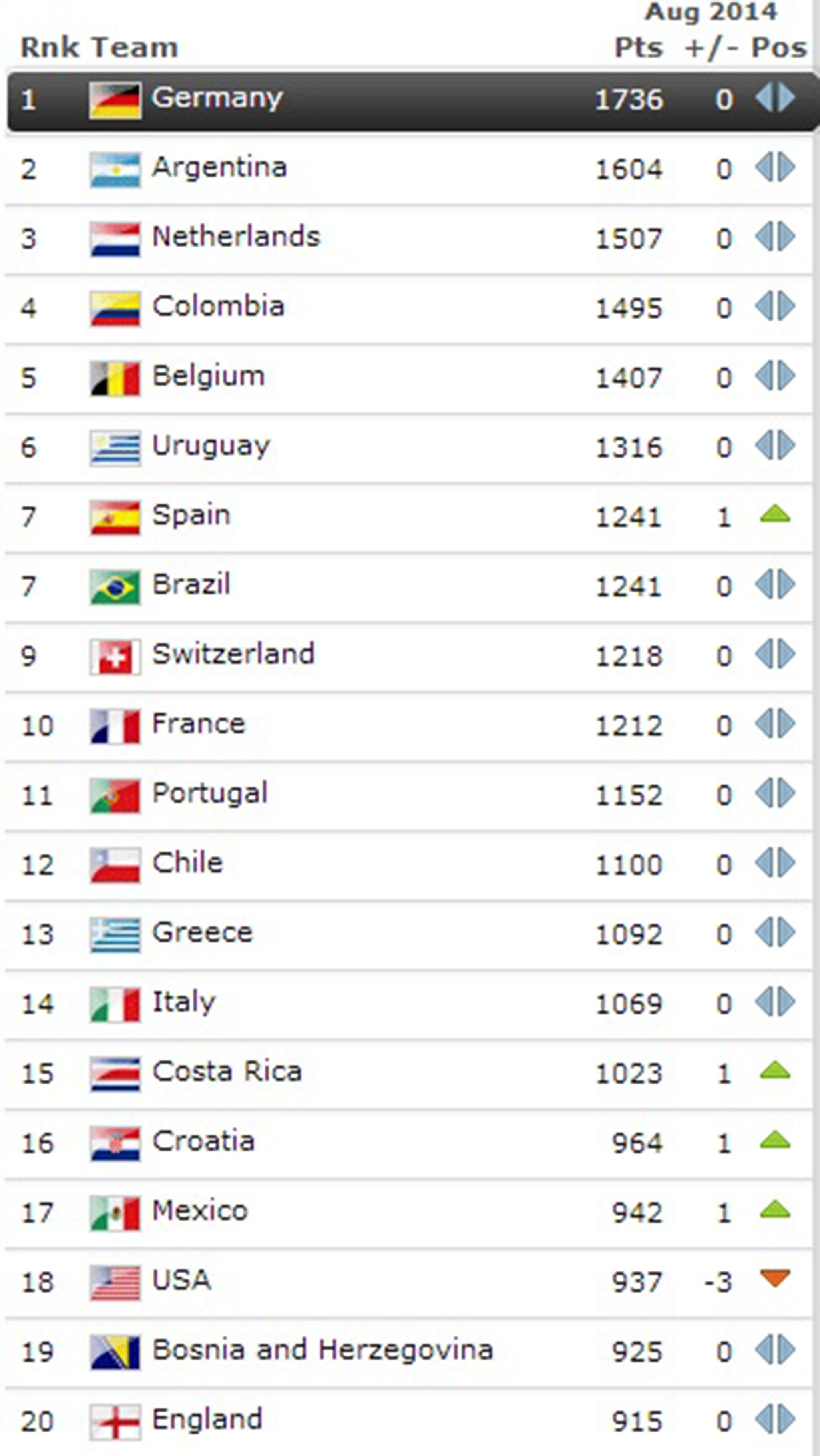 The World Cup winners Germany keep their place on top of the rankings, with the runners-up Argentina in second place.