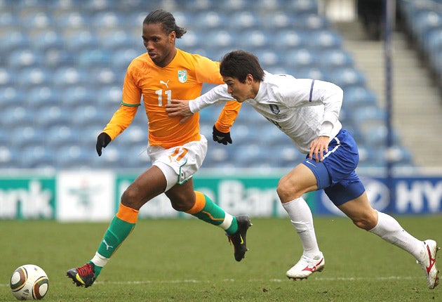 The Elephants were being coached by Kouadio Georges after the sacking of Vahid Halihodzic last month and he handed starts to the Chelsea striker Drogba, Arsenal defender Emmanuel Eboué and Portsmouth forward Aruna Dindane. South Korea were captained by the Manchester United winger Park Ji-sung, who was joined in the starting line-up by the Bolton forward Lee Chung-yong and Celtic midfielder Ki Sung-yong.