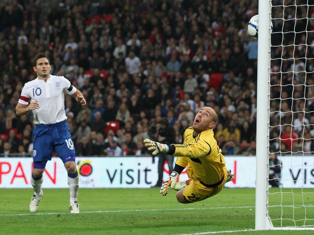 All the more out of the blue then was an England goal within four minutes of the restart, which finally brought the game and the crowd to life. Spain had sent on Cesc Fabregas and Chelsea's Juan Mata for Silva and Xavi, as well as Liverpool's Pepe Reina, who must have been stunned that his first involvement was retrieving the ball from his net. Lampard, left all alone, put it there from perhapsa foot out after Bent rose well to meet James Milner's free-kick, heading down and on to a post.