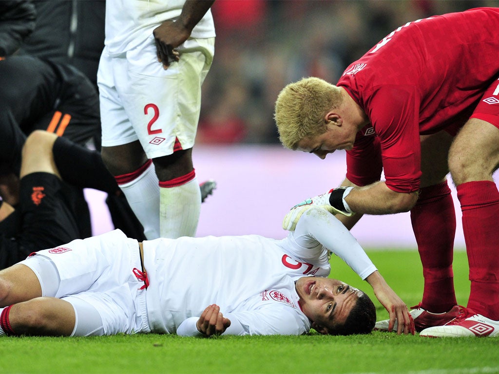 In the early stages, Adam Johnson, who began on the right side cutting in on his stronger left foot and later, after the withdrawal of Gerrard, from the left, was the brightest spark. On 26 minutes, the Manchester City winger doubled back twice on De Jong and Joris Mathijsen before he hit a shot that deflected wide off Johnny Heitinga.