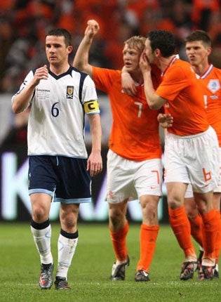 The Oranje will win Group Nine at a canter. They are weaker the further back you go in the team, allegedly, but you have to test a goalkeeper to check that, and that did not happen in the Amsterdam ArenA. The best chance for Scotland, aside from a header in the net by Gary Caldwell, which was disallowed for a push, fell to Kenny Miller. Free on goal, he hesitated far too long before shooting and the ball was cleared.