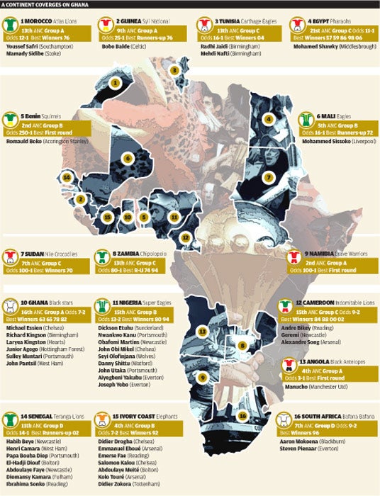 As hosts, Ghana, who get the competition under way against Guinea today, are understandable favourites, but two major question-marks hang over them. Firstly, for all the power of their midfield, they lack a goal-scorer,and secondly, that midfield, despite featuring Michael Essien and Sulley Muntari, is missing a key link in Stephen Appiah. Ghana's captain was an awesome force in the World Cup, and when Ghana hammered Nigeria 4-1 at Brentford last year with the trinity in situ, it seemed this tournament could be a walkover. Since Appiah succumbed to a knee injury, though, Ghana have lost 5-0 in a friendly to Saudi Arabia. That was freakish but, still, the doubt remains.
