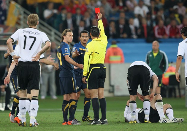 Cahill was sent off in the 56th minute for a challenge on German midfielder Bastian Schweinsteiger, with Australia trailing 2-0 in Durban.