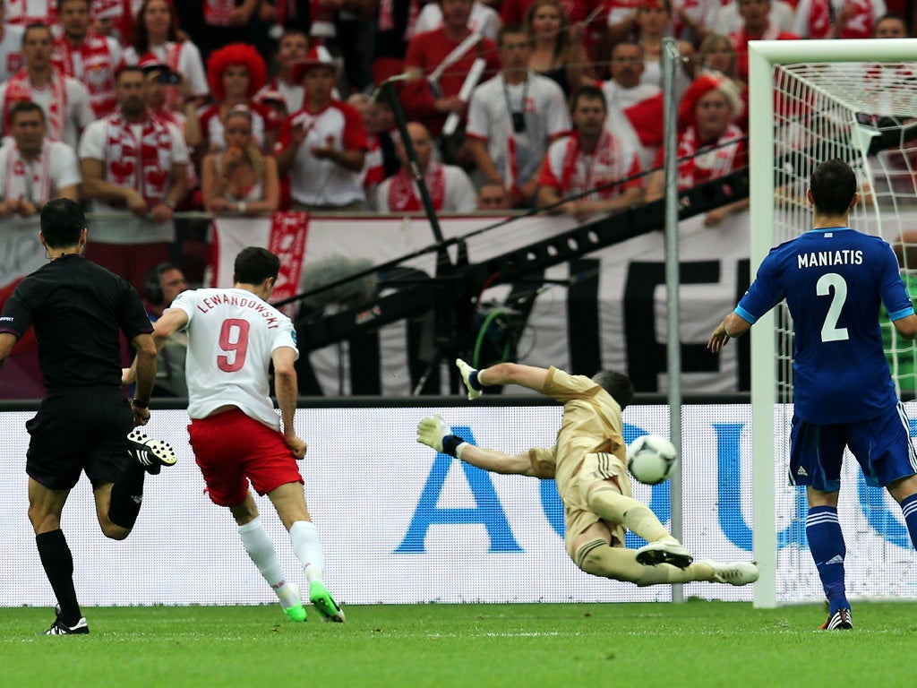 This time the cross was from Jakub Blaszczykowski, and from wider on the right, but Lewandowski had bet on a fine delivery from his other Dortmund colleague and knew exactly what to do, nodding it downwards so that the ball bounced under Chalkias's dive, its velocity making light of a range of 12 yards. Little over a quarter of an hour had gone and the tournament had the boost it needed. The crowd exploded.