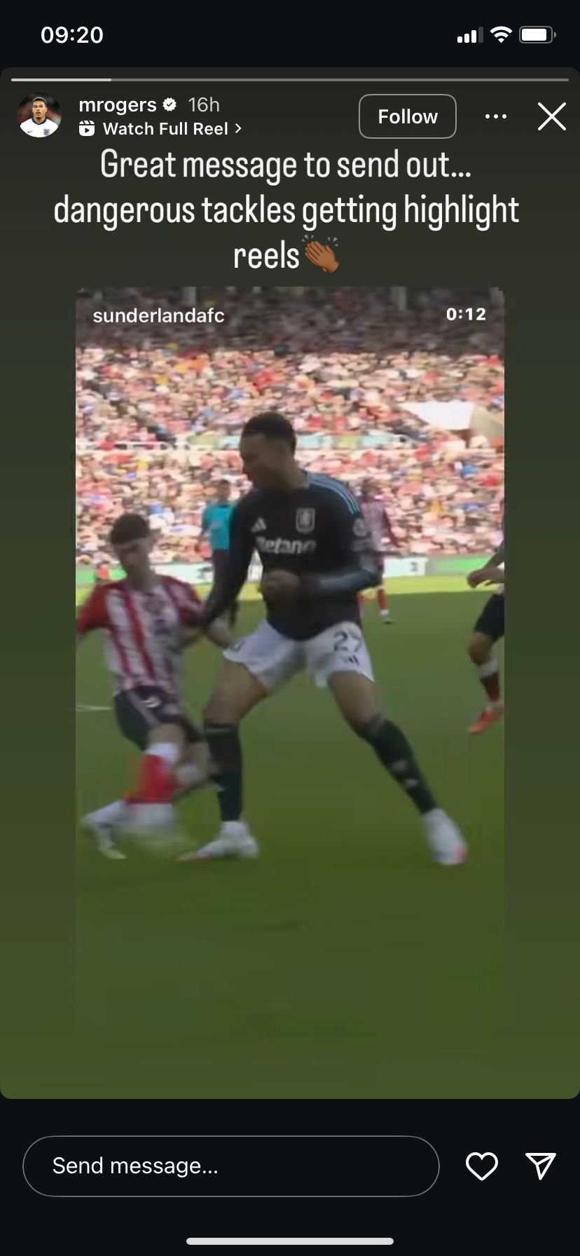 Morgan Rogers has criticised a Sunderland social media post that appeared to glamourise a tackle by Trai Hume, with the Aston Villa star condemning it as “dangerous”.