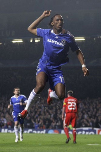 And then there was Drogba. Prior to the match Chelsea TV had been showing a rerun of last year's semi-final. There was Andrei Shevchenko running down time by the corner flag, and Avram Grant, the then manager, falling to his knees at the final whistle. It seemed an age ago. Chelsea are seeking their third manager post-Grant, Sheva is warming a different bench. But there are some constants. Under Hiddink, Drogba has seemed to be back to doing what he does best (besides sulking, pouting and falling over): monstering defenders. Liverpool's have been particular victims over the seasons but for a long time last night it seemed Drogba had called a truce. In the opening minutes he went down in apparent season-ending agony after a mild challenge from Jamie Carragher.