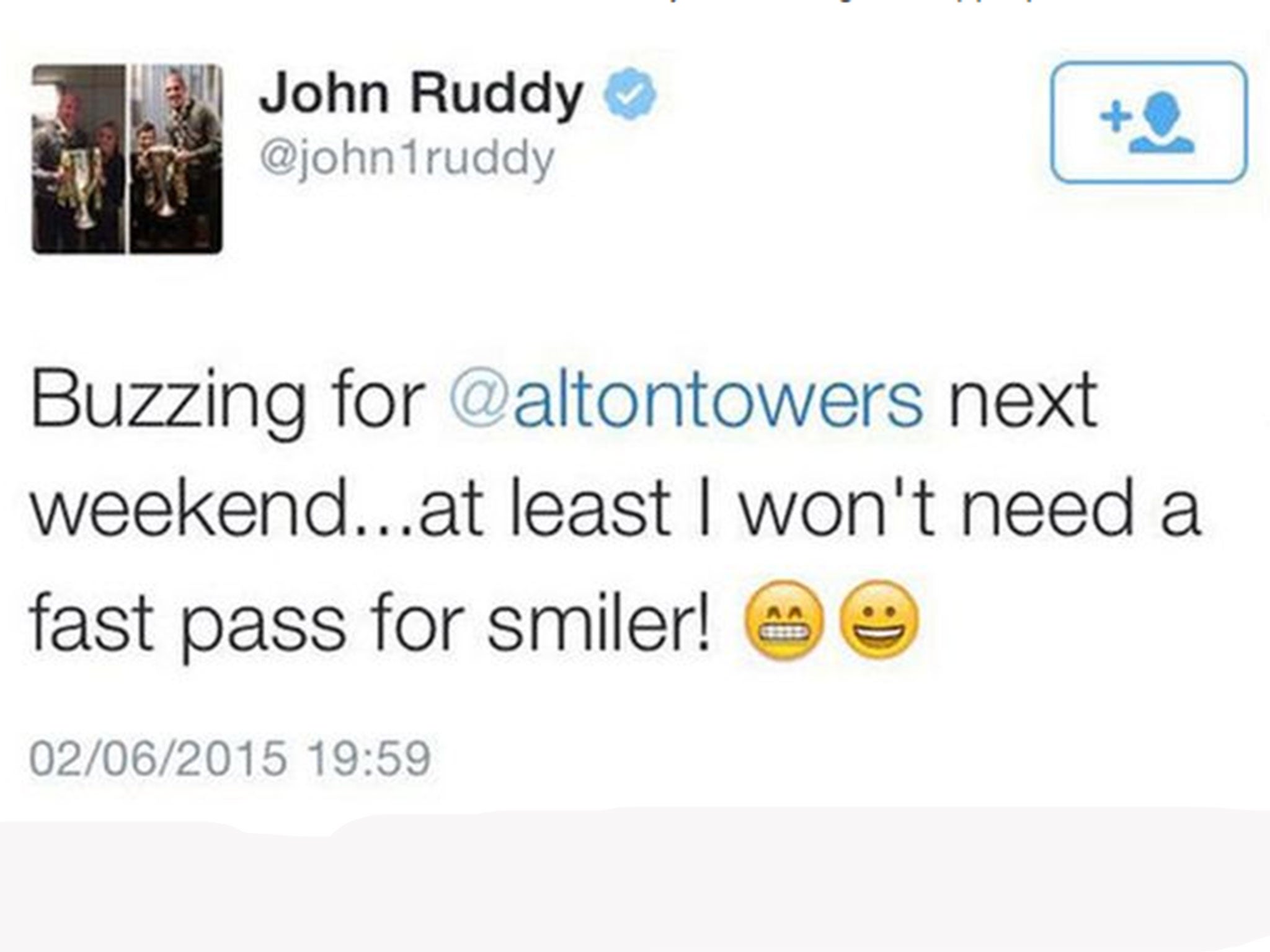 It read: "Buzzing for @altontowers next weekend...at least I won't need a fast pass for smiler!"