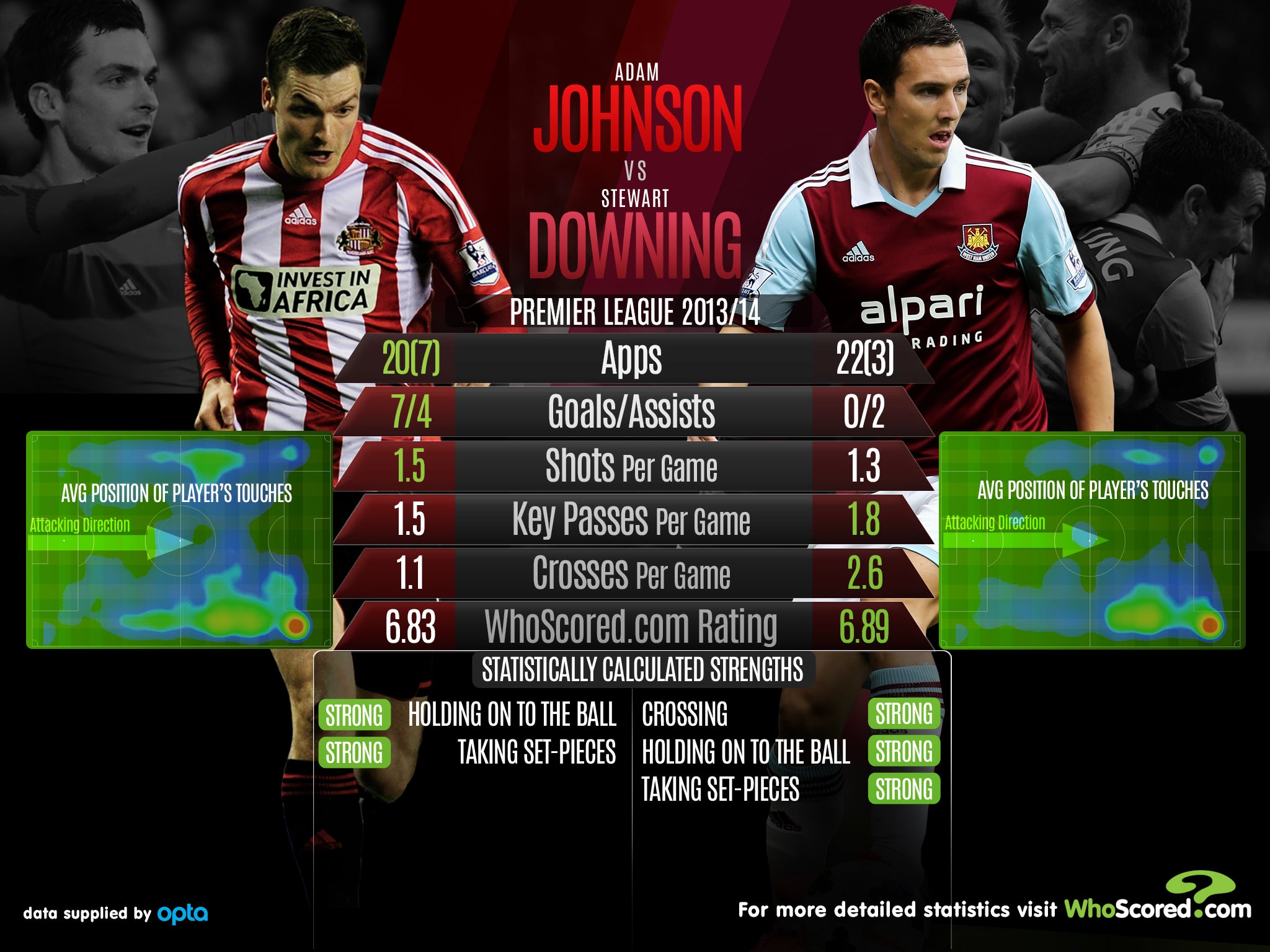 Ahead of this weekend's Premier League meeting, between Sunderland and West Ham, see how the sides' players Adam Johnson and Stewart Downing compare.
