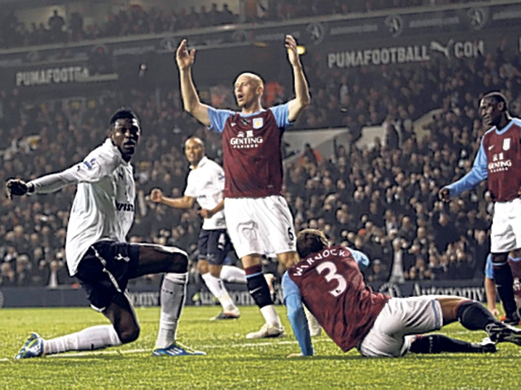 Villa twice went close in the opening 120 seconds, through a Heskey header and a wayward Darren Bent shot, but it was not until the 30th minute that they again darkened Spurs' door, the former's pass for the latter a touch too heavy.