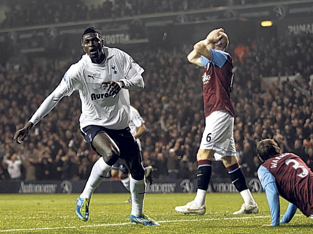 Adebayor lifts Spurs to third as Villa show only fear
