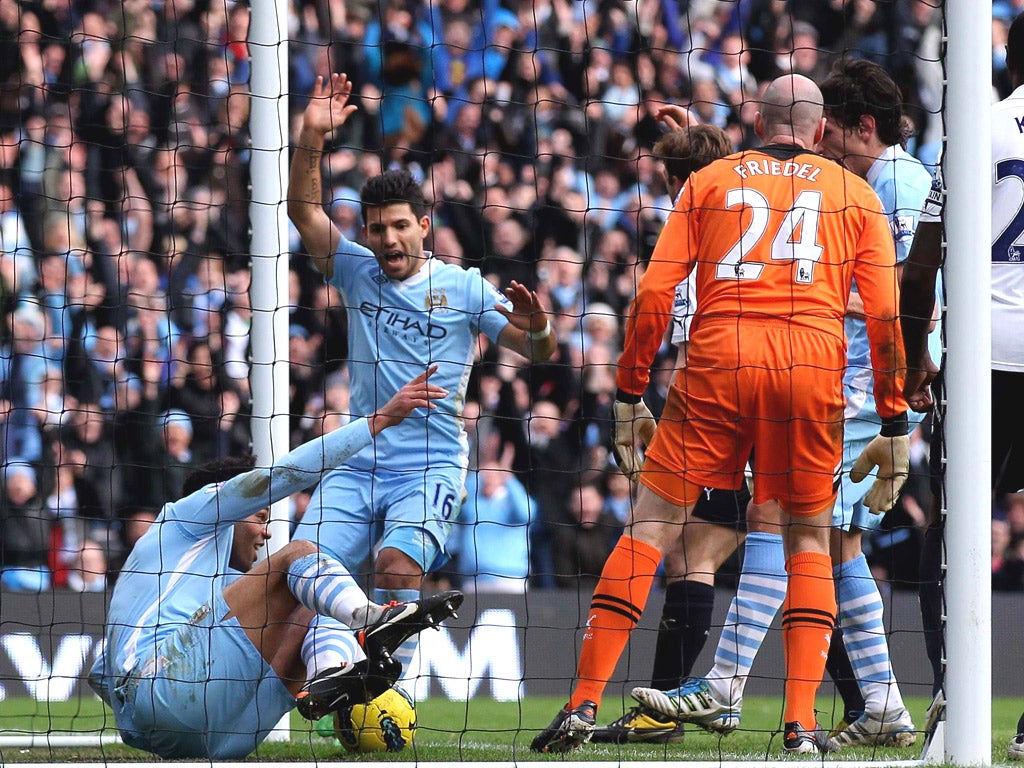 With those two missing, the balance of game was immeasurably delicate and controversy should certainly not disguise the product: another sublime episode in this season's incredible Premier League story. It was one in which City seized the ascendancy and surrendered it, as nine extraordinary second-half minutes offered up four goals, then almost lost altogether before Ledley King was correctly judged to have scissored Balotelli in the penalty area.