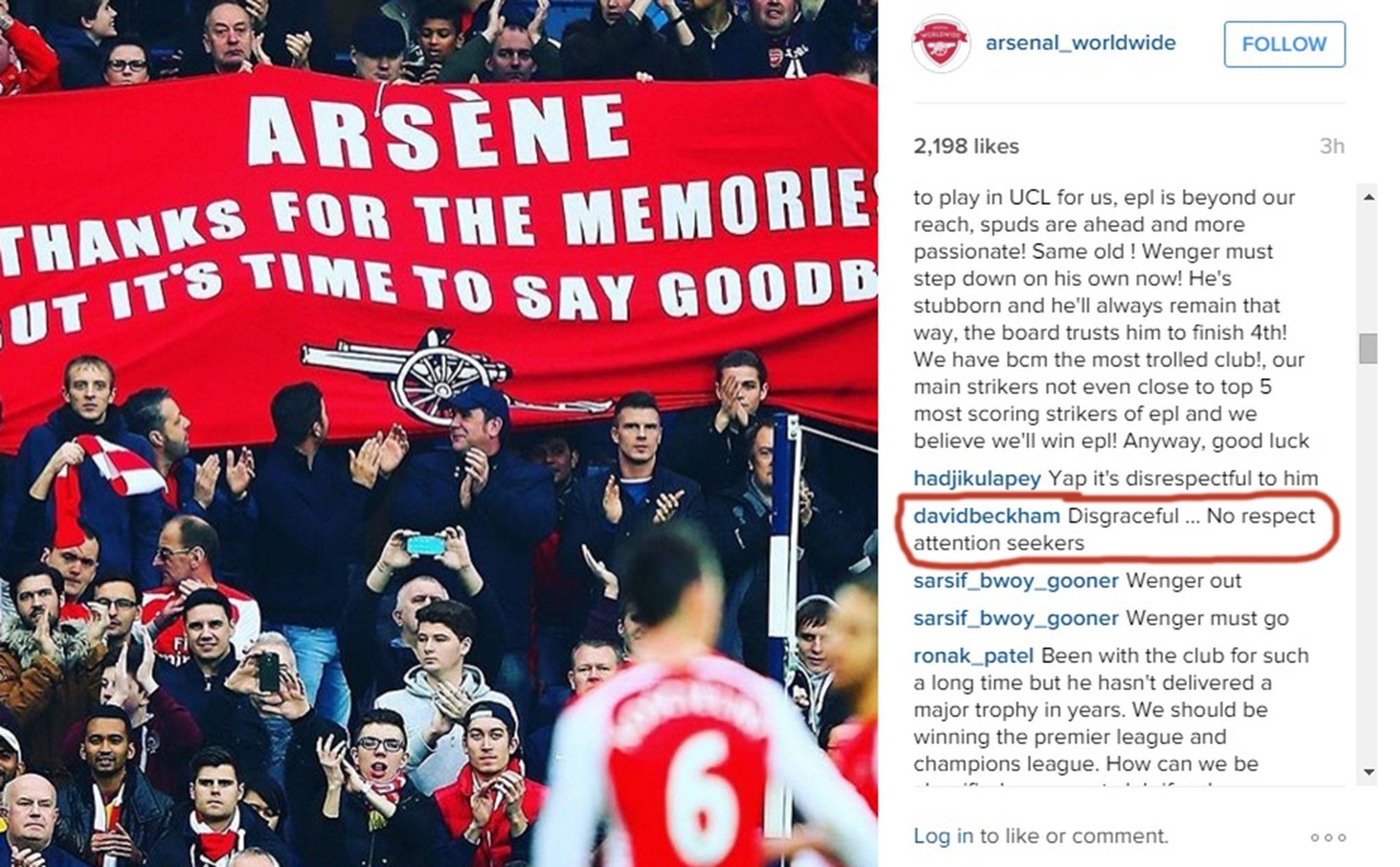 Beckham called a fan's anti-Wenger banner 'disgraceful'