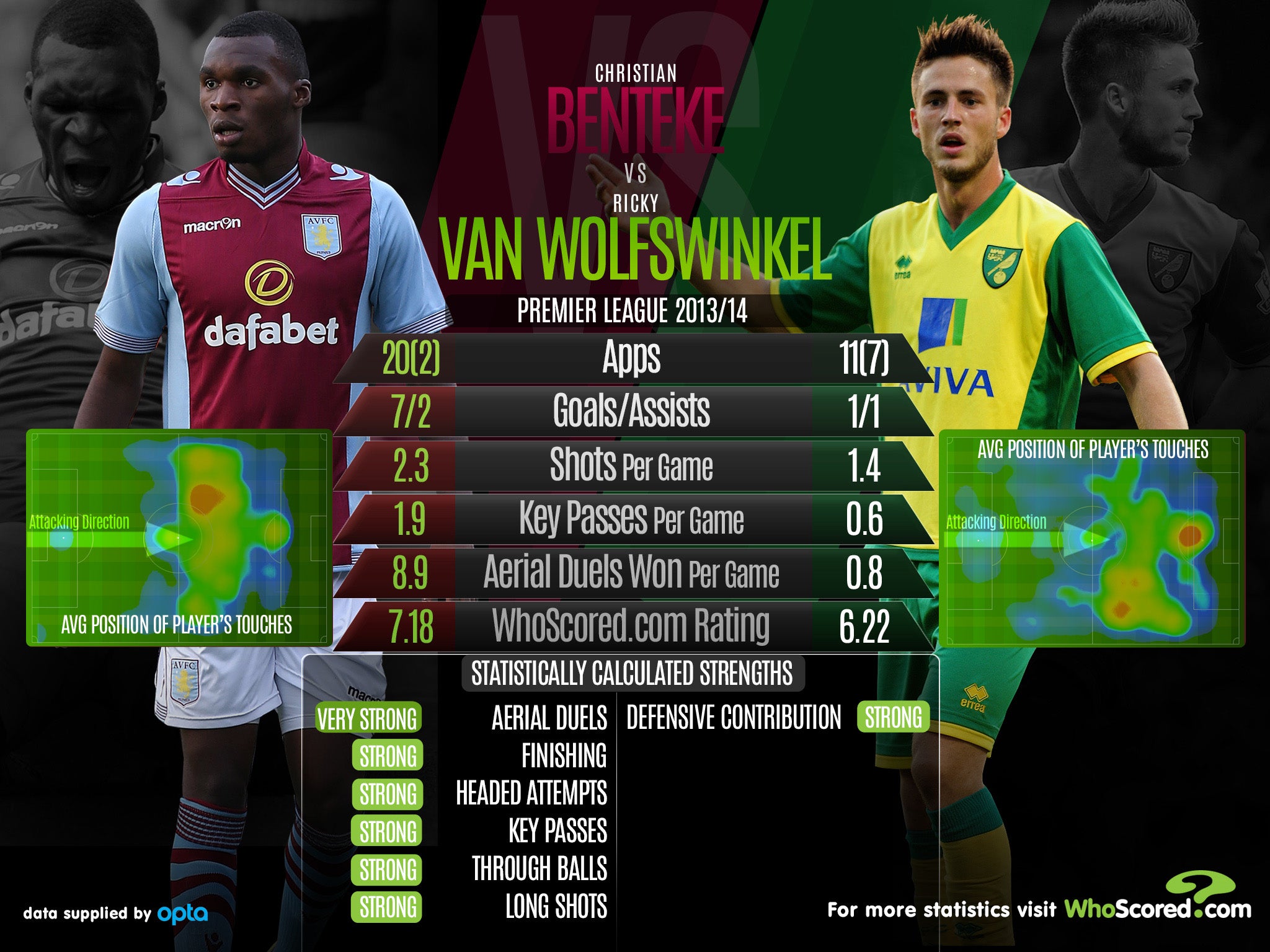 Ahead of this weekend's Premier League meeting, between Aston Villa and Norwich City, see how the sides' players Christian Benteke and Ricky van Wolfswinkel compare.