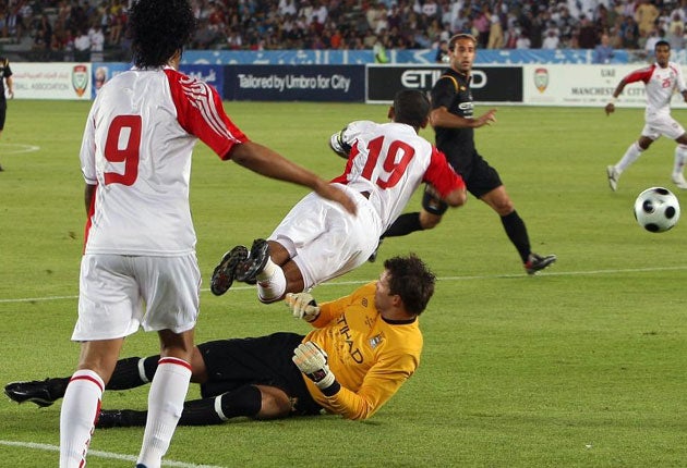 Manchester City fell behind after only nine minutes of their tour match against the United Arab Emirates yesterday when goalkeeper Stuart Taylor dived awkwardly at the feet of the Emirati captain Saeed al Kas and striker Mohamed al Shihi converted the penalty.