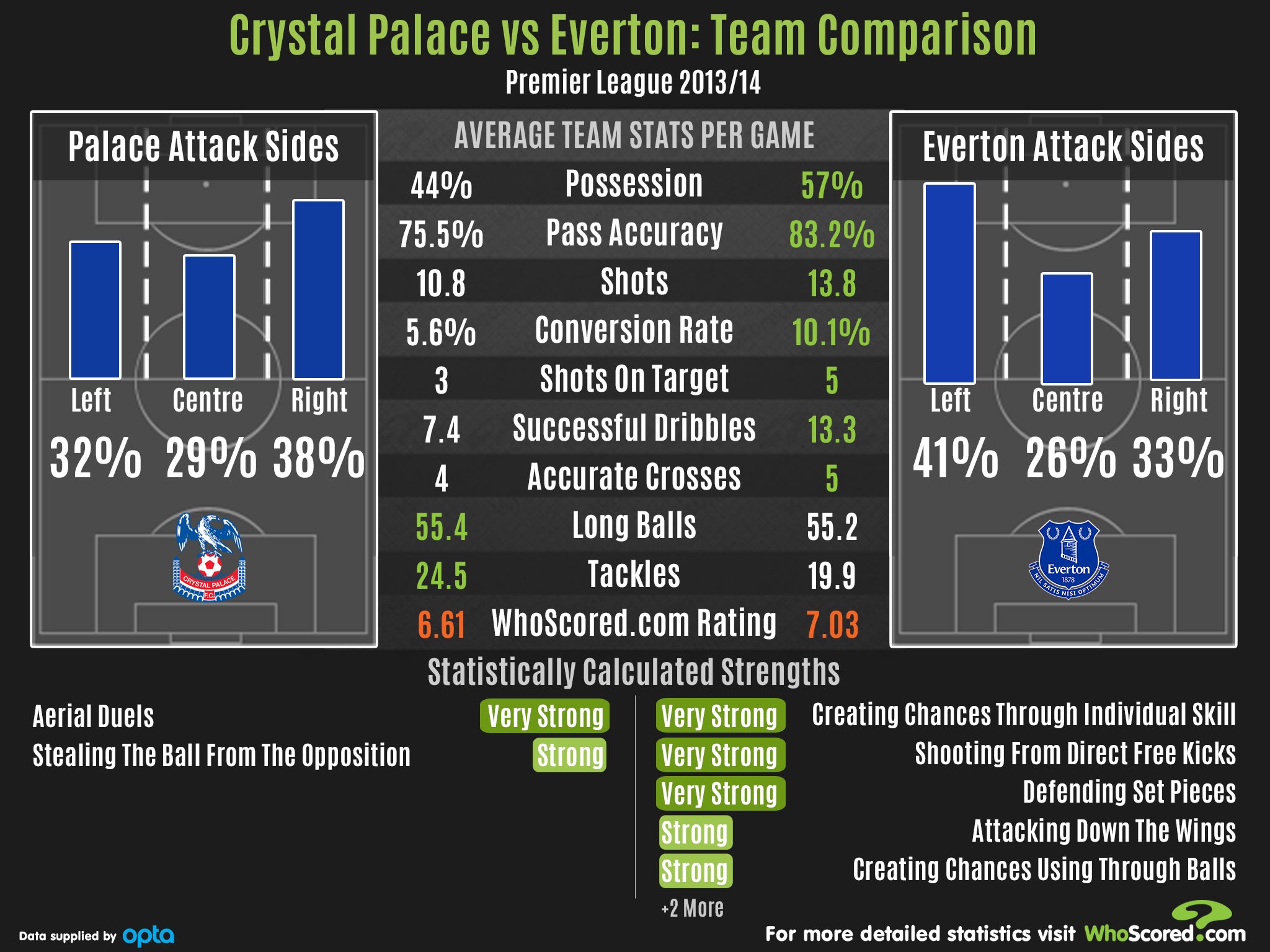 Your support makes all the difference. Read more Ahead of this weekend's Premier League meeting, between Crystal Palace and Everton, see how the sides compare on possession, pass accuracy, tactics and much more.