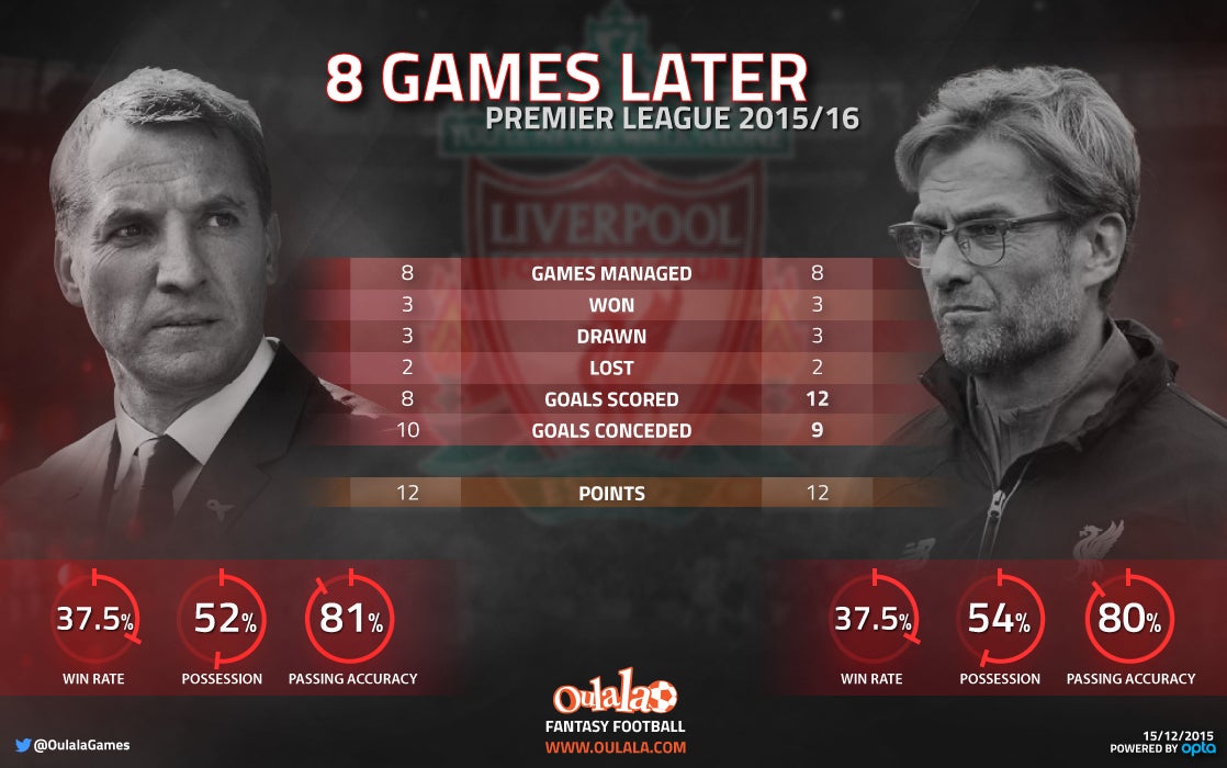 Jurgen Klopp has now managed Liverpool in eight Premier League games this season, exactly the same amount as his predecessor Brendan Rodgers did with the club this term.