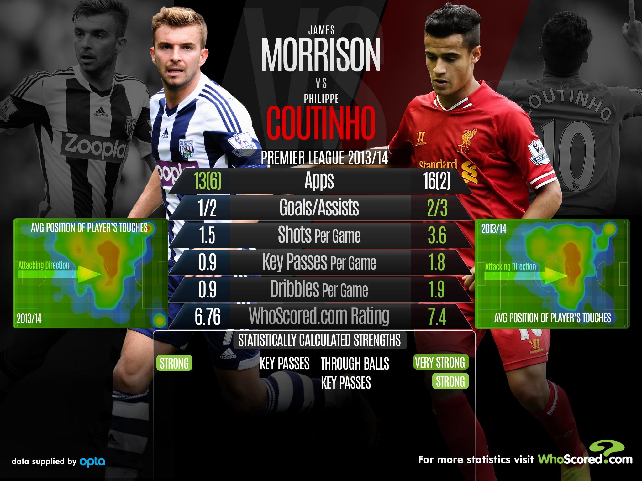 Ahead of this weekend's Premier League meeting, between West Brom and Liverpool, see how the sides' players James Morrison and Philippe Coutinho compare.