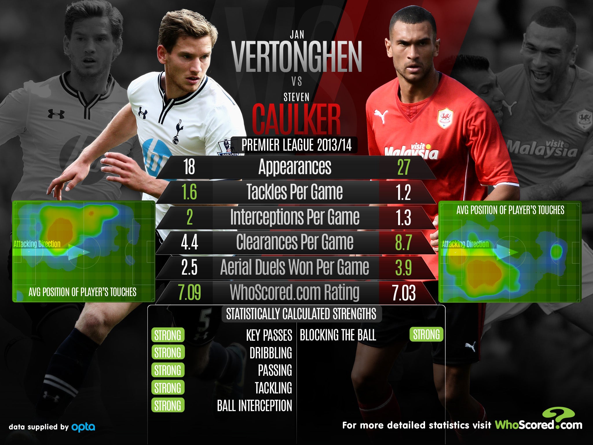 Ahead of this weekend's Premier League meeting, between Tottenham Hotspur and Cardiff City, see how the sides' players Jan Vertonghen and Steven Caulker compare.