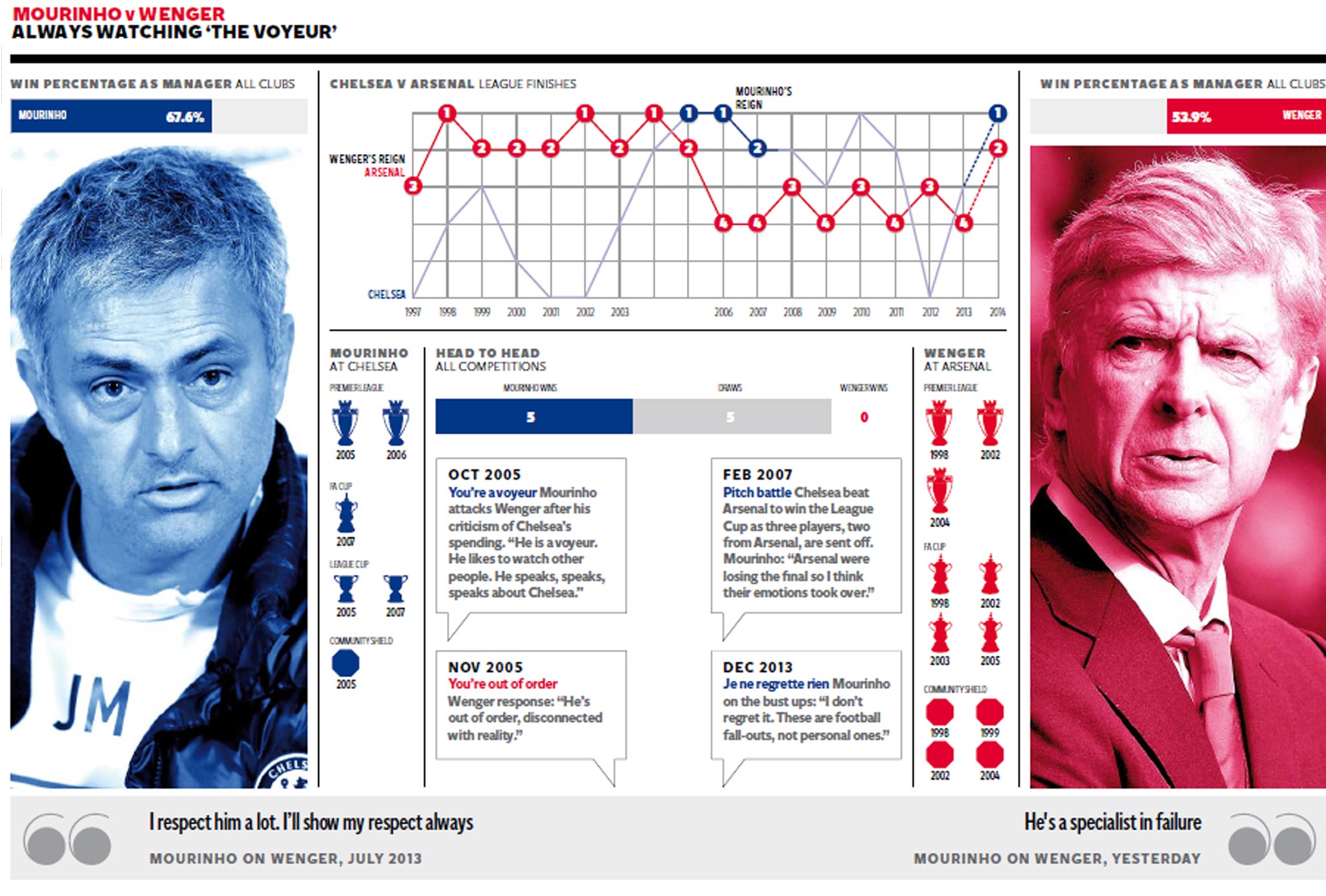 There are many who dislike Mourinho. There are some who believe that he went over the top yesterday in calling Wenger a “specialist in failure”. But the Arsenal manager will undoubtedly have known that as soon as he suggested that it was “fear to fail” that was driving Mourinho that there would be a response. That the response was spikier, harder, is simply the way it has always been with Mourinho and it would have been no different were it Sir Alex Ferguson.