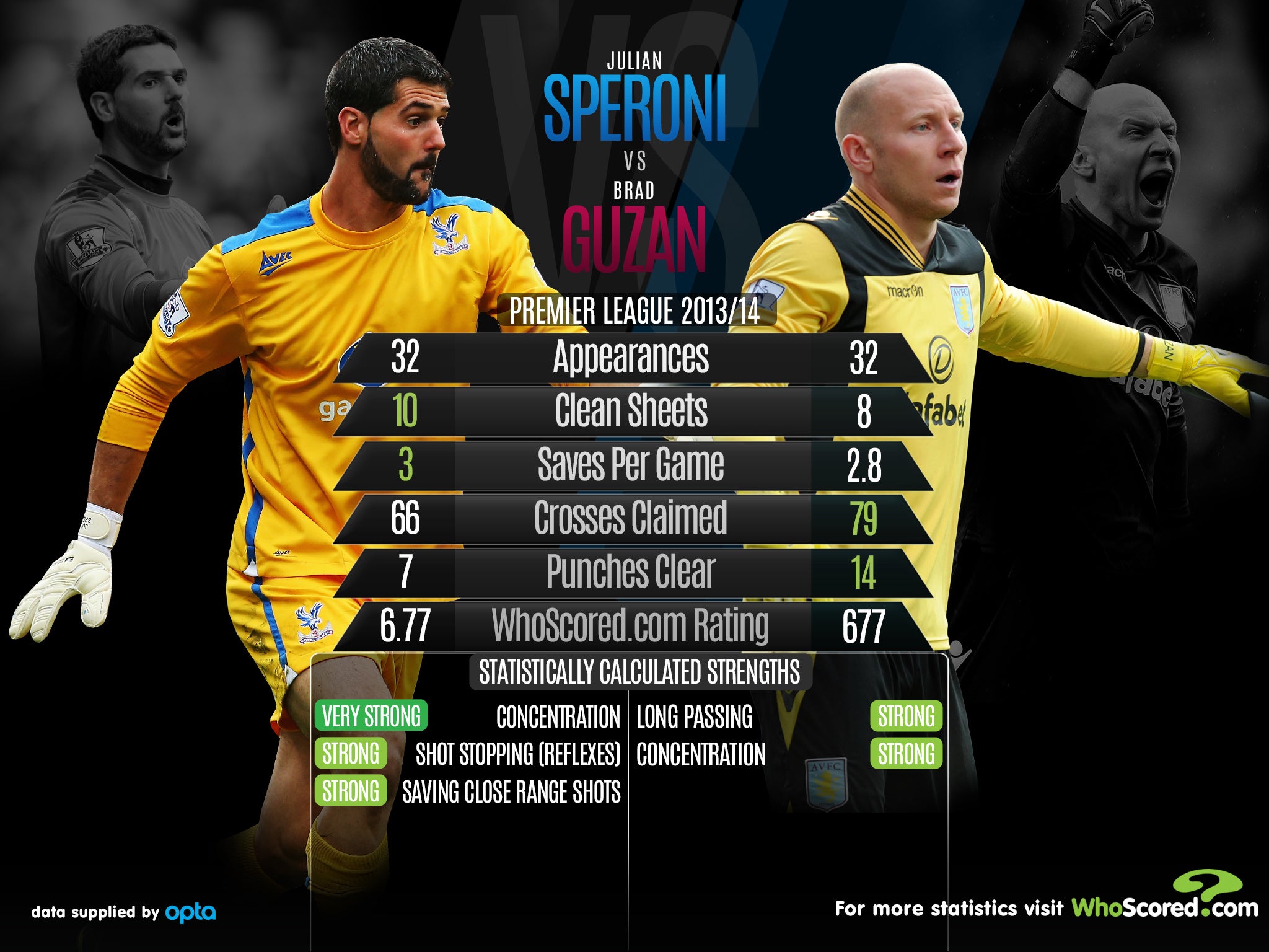 Ahead of this weekend's Premier League meeting, between Crystal Palace and Aston Villa, see how the sides' players Julian Speroni and Brad Guzan compare.