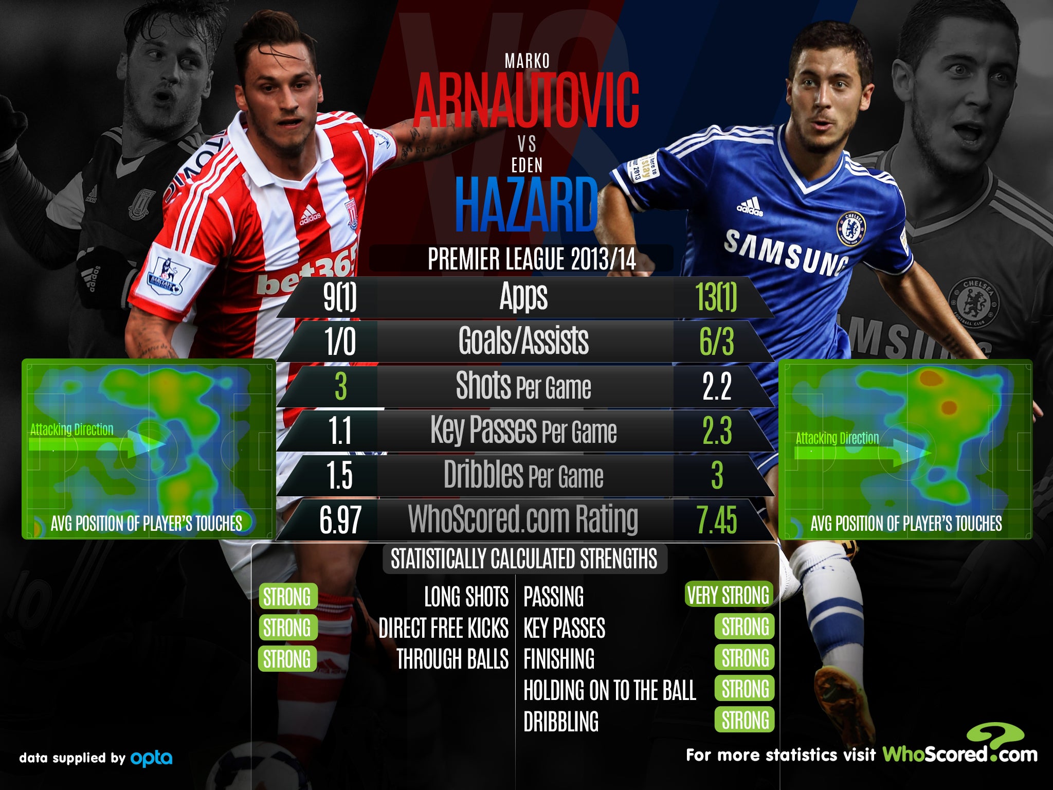 Ahead of this weekend's Premier League meeting, between Stoke City and Chelsea, see how the sides' players Marko Arnautovic and Eden Hazard compare.