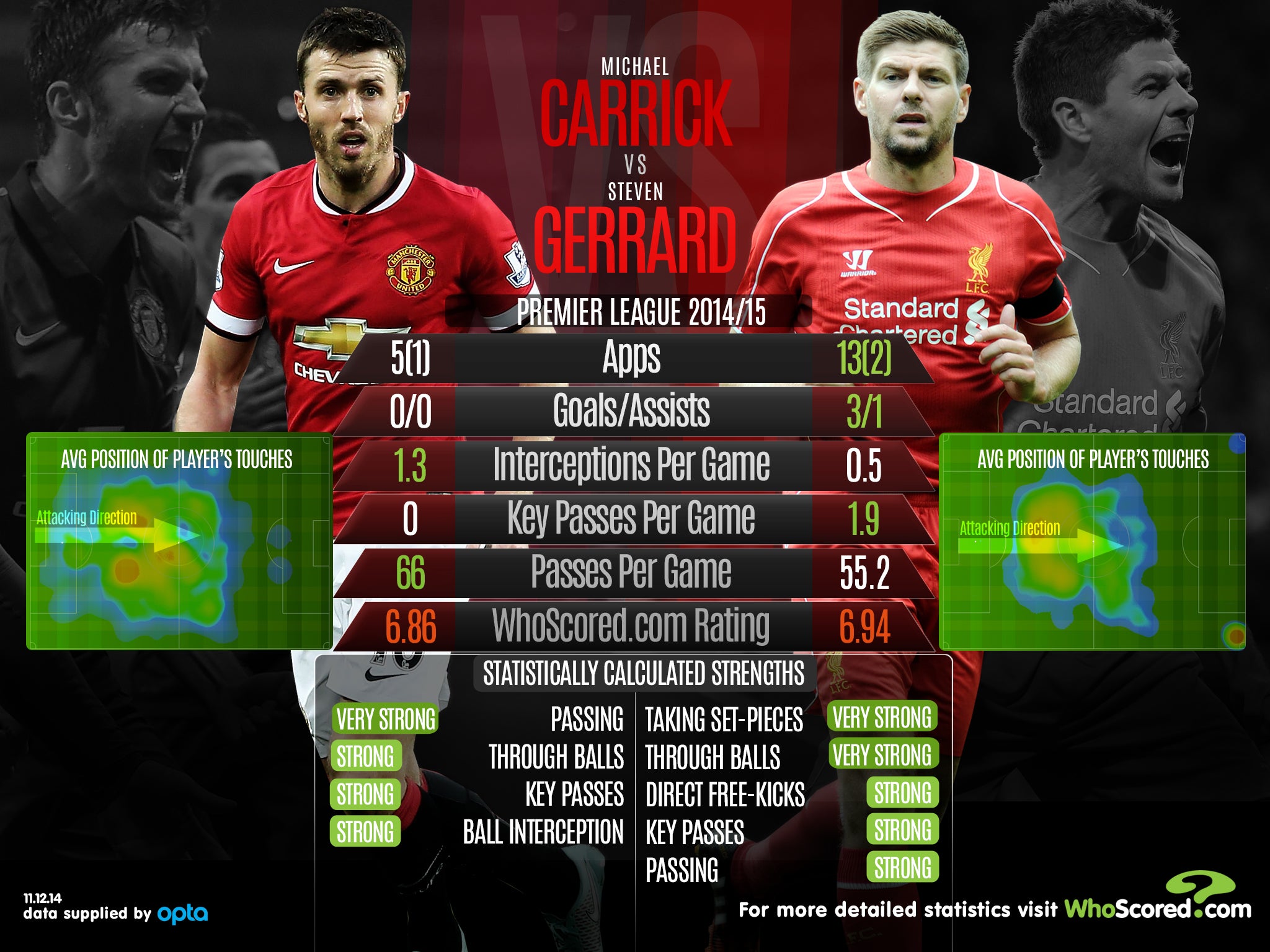 Ahead of the match at Old Trafford, we take a look at how the sides' midfielders Michael Carrick and Steven Gerrard compare.