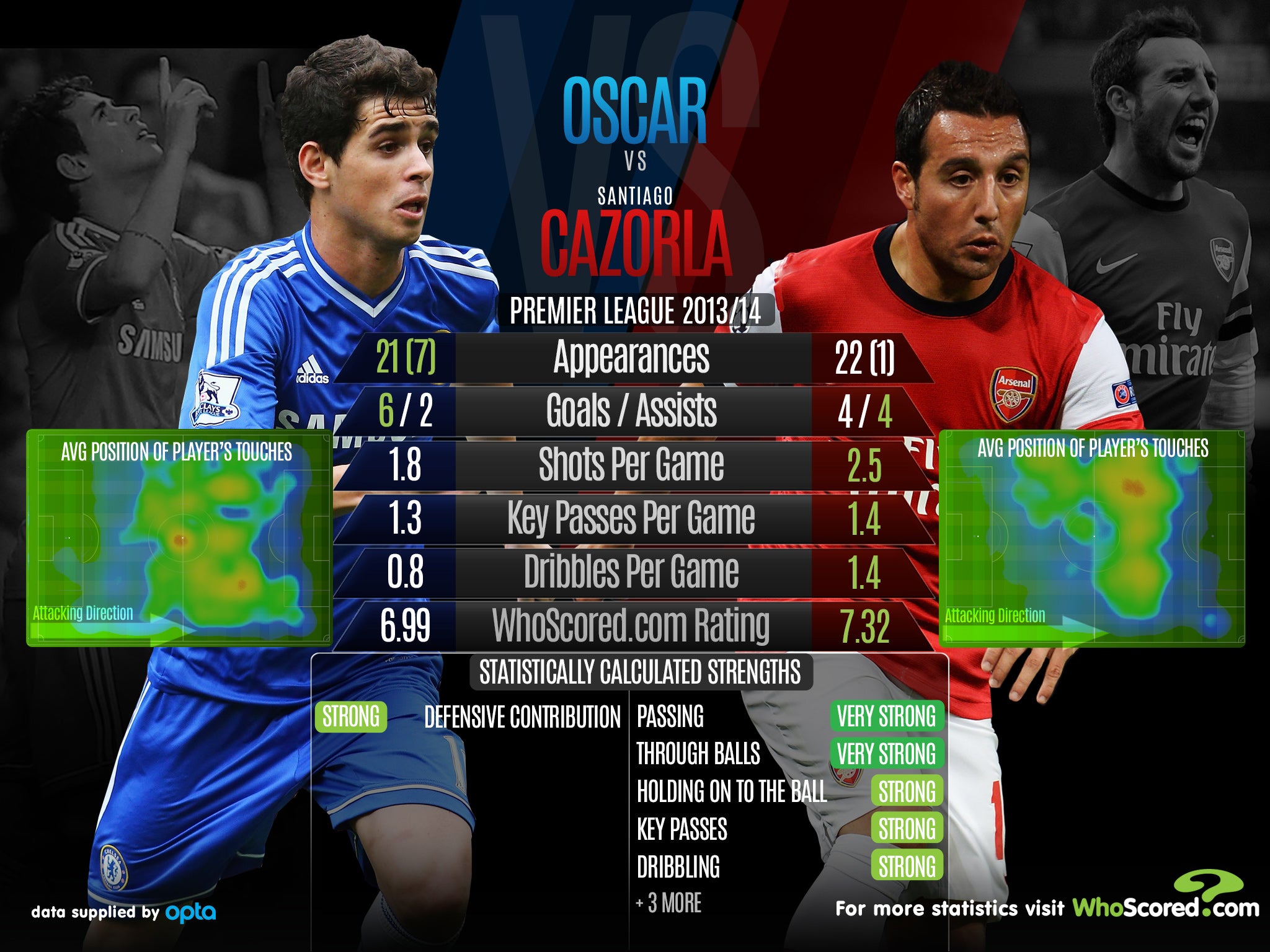 Ahead of this weekend's Premier League meeting, between Chelsea and Arsenal, see how the sides' players Oscar and Santi Cazorla compare.