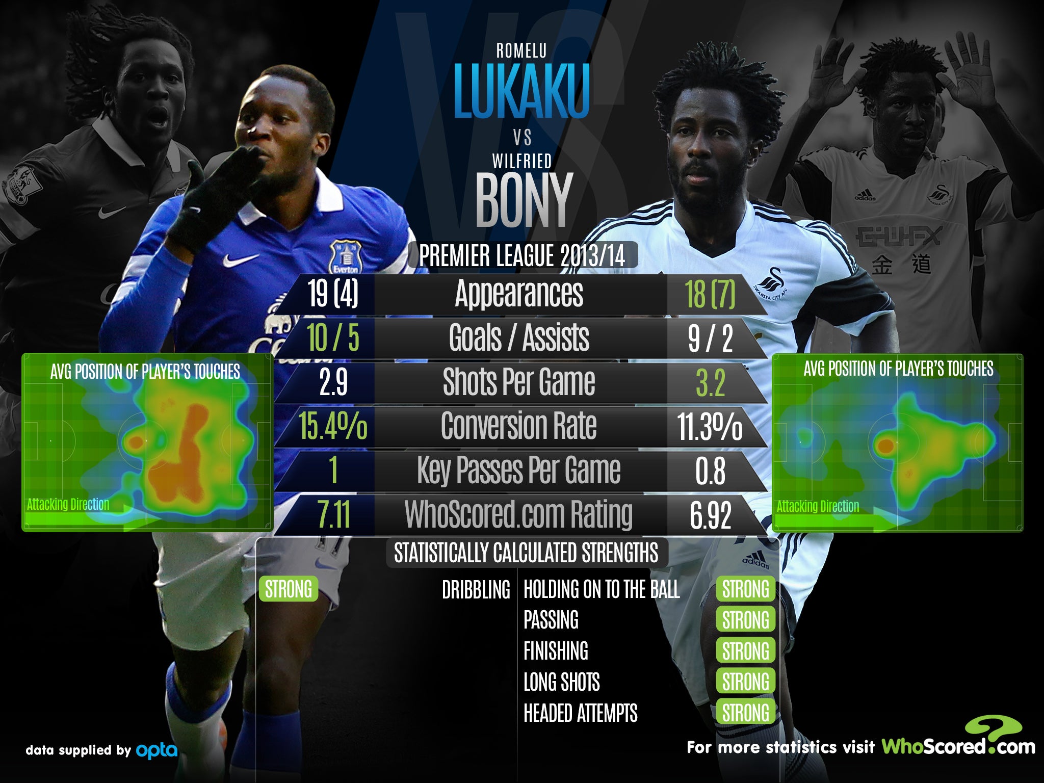 Ahead of this weekend's Premier League meeting, between Everton and Swansea City, see how the sides' players Romelu Lukaku and Wilfried Bony compare.