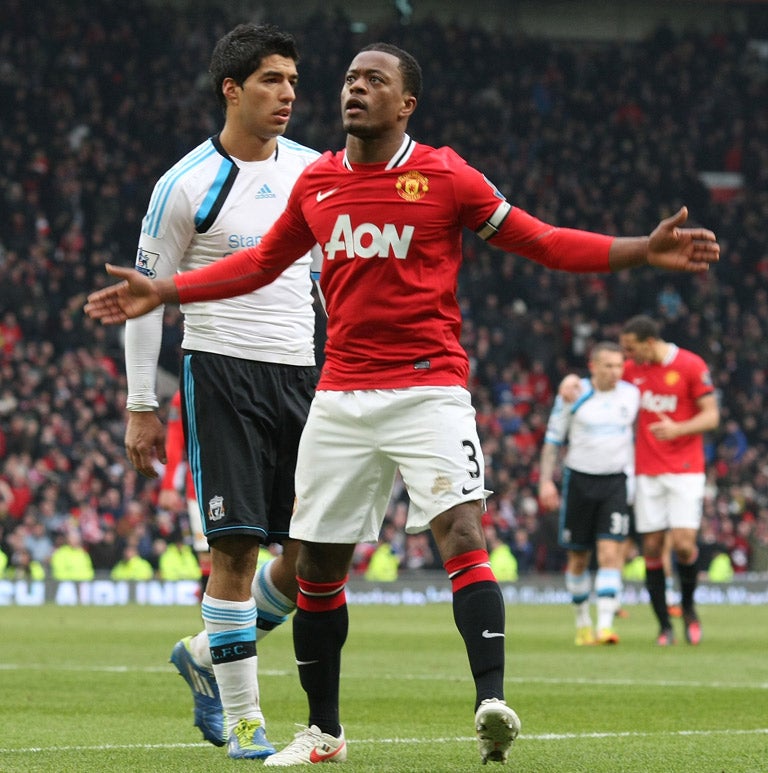 At the full-time whistle Evra was no longer prepared to subdue his raw feelings, dancing all round the pitch waving his arms in delight. When he did so dangerously close to Suarez, with other Liverpool players threatening to offer a reprimand or more, the referee Phil Dowd stepped in quickly and sensibly to steer Evra away and hold him back until everyone else had disappeared down the tunnel, with yellow-jacketed stewards again well represented.