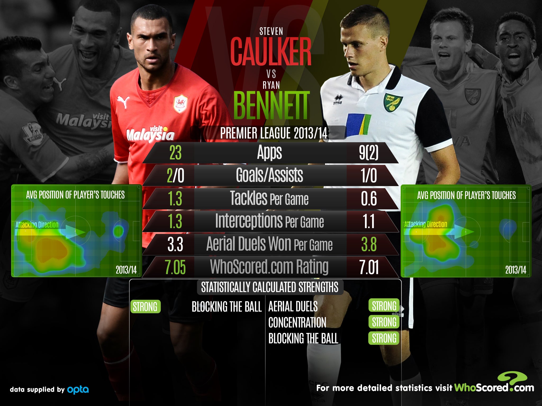 Ahead of this weekend's Premier League meeting, between Cardiff City and Norwich City, see how the sides' players Steven Caulker and Ryan Bennett compare.