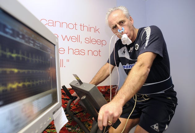 "Look at Gérard Houllier. He had this test booked, but didn't come, and ends up in hospital. The job is stressful, it's high-pressure, high-maintenance, very public. The games are stressful. Sam's heart-rate was higher at that game when he was wired up than when he fell off the running machine. We're in the middle of playing Bolton away, Man U at home, Burnley away and Villa at home. That's stressful. You don't really switch off, you'll be watching TV and thinking, 'should I play him, or him?' Results affect you and the disparity between the feelings is wrong. You are not high as a kite when you win, but when you lose you are very low.