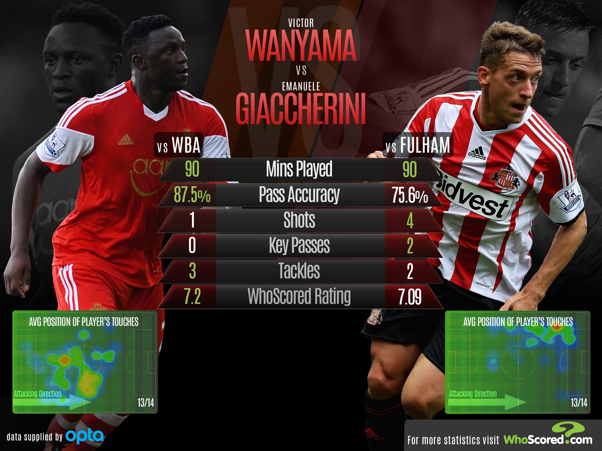 Ahead of this weekend's Premier League meeting, between Southampton and Sunderland, see how the sides' midfielders Victor Wanyama and Emanuele Giaccherini compare.