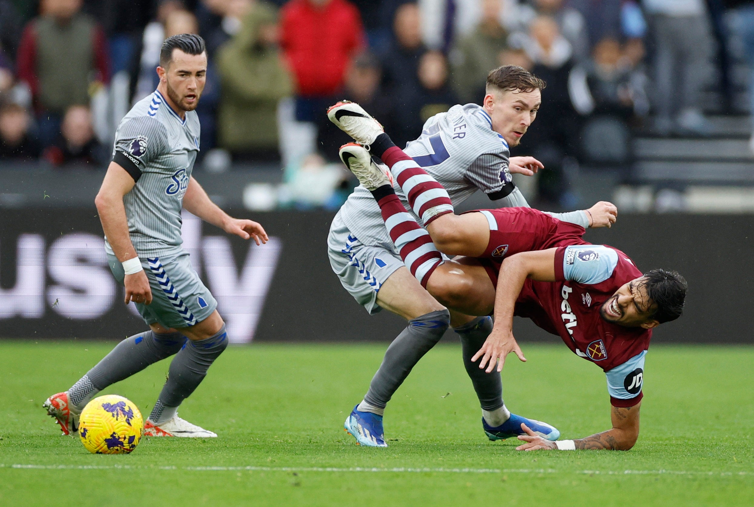 The West Ham players are furious. The game is stopped with McNeil on the floor. The Everton man stays on the floor for a short period before returning to his feet.