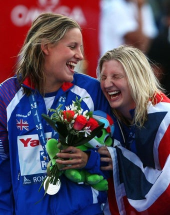 Joanne Jackson and Rebecca Adlington won the British Gas swimming team's first medals as they took silver and bronze respectively in the women's 400m Freestyle.