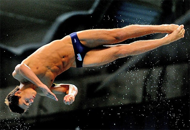 He did so in the third round of what proved to be a truly thrilling duel in the Commonwealth Games diving pool yesterday. Daley was trailing his arch rival Matt Mitcham in the 10m platform final when he launched himself from the board high up in the Dr SP Mukherjee Aquatics Complex into a spectacular inward three-and-a-half somersault, hitting the water like an arrow, at 30mph.