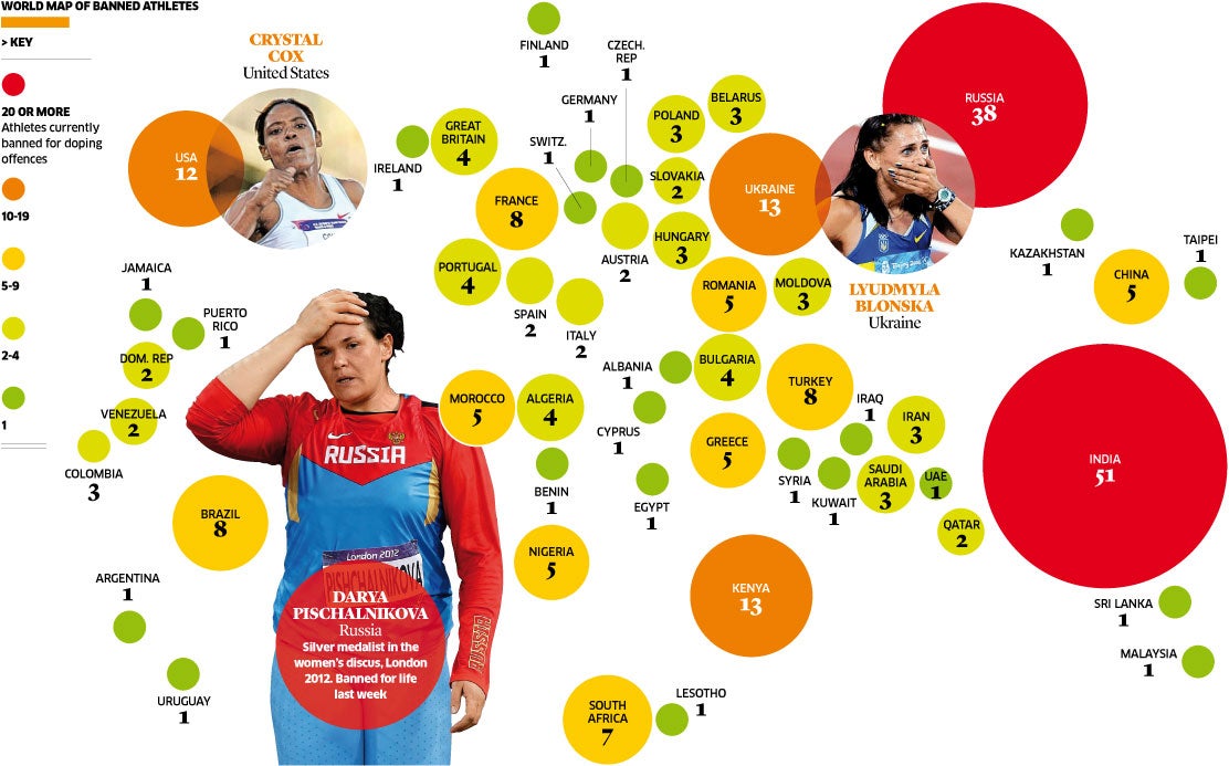 There are currently 240 men and women who are banned from athletics, from 52 countries and, as our world map shows, there are some countries where bans are markedly more common than others.