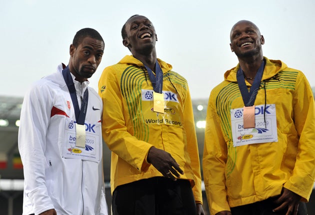 The man from Kentucky pushed his body so hard in attempting to keep within range of Bolt in the 100m final 15 days ago he aggravated the groin problem that restricted his training ahead of the World Championships. He withdrew from the 200m in Berlin and today's 100m will be his first shift back at the home-straight office since the night he ran the race of his life, a 9.71sec US record, only to find himself eclipsed by Bolt's 9.58sec world record blitz.