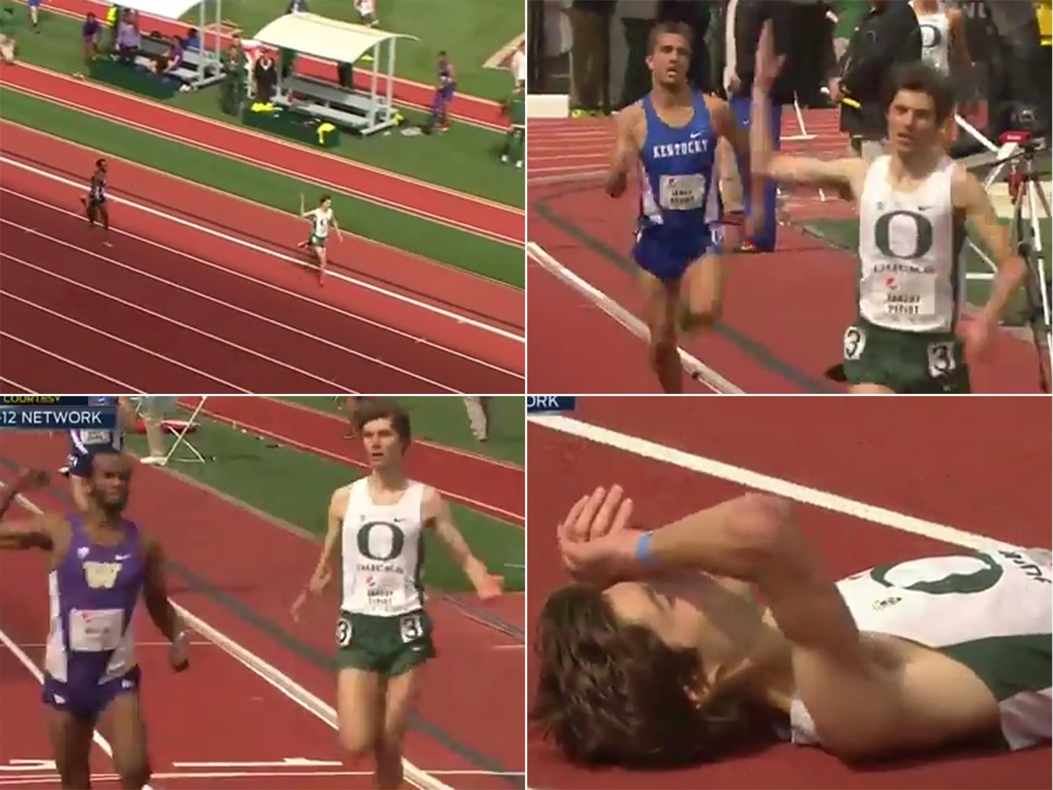 With a healthy lead and the finish line in site, the University of Oregon runner began to celebrate, geeing on the 3,000 strong crowd lining the finish straight and slowing his pace to milk it all.