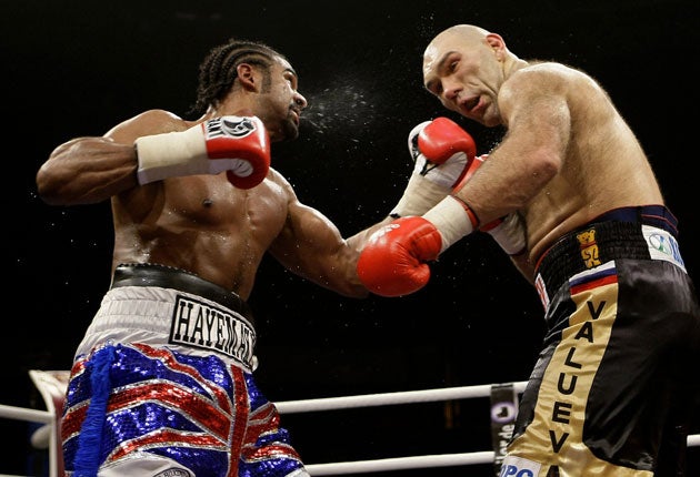 It looks increasingly likely that the Venezuelan-based WBA will insist that King's fighter John Ruiz, an old-school veteran who has twice lost tight decisions to Valuev, gets the first shot at Haye's belt. The fight could be at the fabulous O2 in south London, a venue that is a walk away from Haye's mother's home, which will be a safe sanctuary from any future critics.